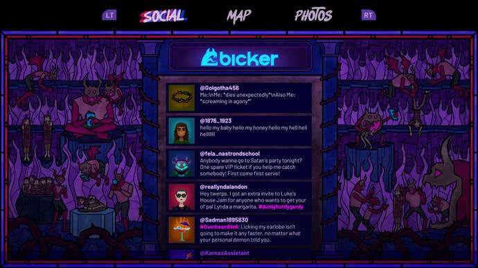In Afterparty, hell even has its own version of Twitter called Bicker, which is a pretty accurate description of what Twitter is used for 98% of the time. You'll see Bicker notifications pop up while you're walking around the islands on the inferno, highlights of which include a grandmother needing her grandson to die so she has tech support in hell again, and God's Archangels being referred to as "God's Seal Team 6." I'm honestly having a hard time with deciding where the writing is at its finest in Afterparty, but it might just be the cultural satire that Bicker provides so deftly.